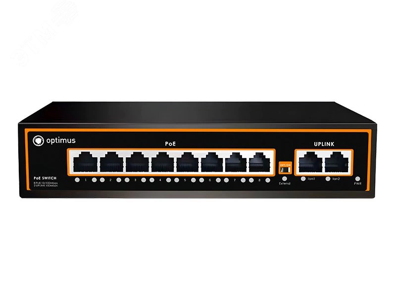 Коммутатор Optimus U1I-8F/2F - неуправляемый PoE-коммутатор. Он оснащен 8 портами 10/100 Мбит/с с поддержкой PoE (технология передачи питания по сетевому кабелю вместе с данными) к каждому из которых можно подключать сетевые устройства (IP-камеры, IP-телефоны, беспроводные точки доступа). PoE-порты 1-8 соответствуют стандартам PoE IEEE802.3af/at. Каждый порт подает питание мощностью до 30 Вт на подключенное устройство. Это позволяет размещать оборудование в труднодоступных местах вне зависимости от расположения электрических розеток и минимизировать прокладку кабеля. Максимальная дальность подключения оборудования составляет 100 метров.