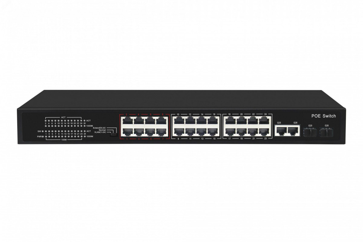 24-портовые коммутаторы для монтажа в стойку 19” с возможностью подключения SFP для соединения с оптическими линиями связи, по PoE позволяют передавать сигнал и питание на расстояние до 250 метров. Режим работы на дальних расстояниях активируется при помощи переключателя, расположенного на корпусе.