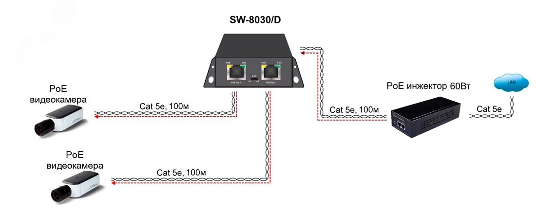 Коммутатор/ удлинитель Gigabit Ethernet на 3 RJ45 порта. Порты 2 х GE (10/100/1000 Base-T) с поддержкой PoE (до 28Вт) + 1 x GE (10/100/1000 Base-T) Uplink с поддержкой питания по PoE (Входная мощность до 60Вт). Соответствует стандартам PoE IEEE 802.3af/at/bt. Автоматическое определение PoE устройств. Суммарная выходная мощность PoE до 56Вт. Питание через порт Uplink (до 60Вт) или разъем DC9-57В для передачи данных или DC37-57В для передачи данных + PoE. Блок питания в комплект не входит. Размеры (ШхВхГ) 88 x25 x 70 мм. Рабочая температура от -10 до +55 градусов.