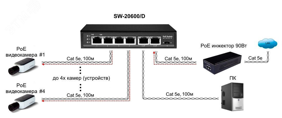 PoE Коммутатор/ удлинитель Fast Ethernet на 6 портов с питанием по PoE. Порты 4 х FE (10/100 Base-T) с поддержкой PoE, 1 x FE (10/100 Base-T) Uplink с поддержкой питания по PoE (до 90Вт), 1 x FE (10/100 Base-T) Uplink. Соответствует стандартам PoE IEEE 802.3af/at. Автоматическое определение PoE устройств. Мощность PoE на порт - до 30Вт. Суммарная мощность PoE - до 87Вт. Поддержка режима CCTВ - Увеличение расстояния передачи данных до 250м, изоляция портов. Встроенная грозозащита - 3kВ. Питание По порту FE (10/100 Base-T) Uplink. Размеры (ШхВхГ) 140 x 28 x 80 мм. Рабочая температура от -10 до +55 градусов.