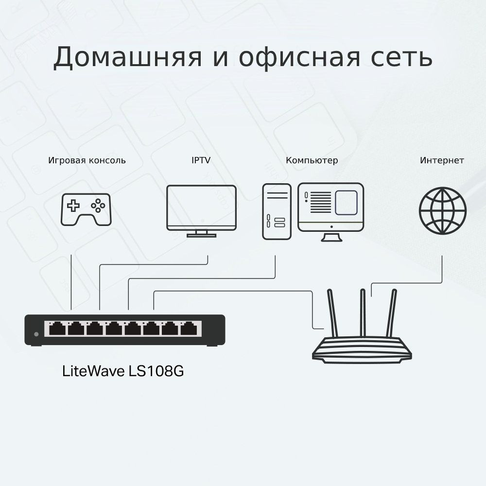 Полное описание: Коммутатор неуправляемый 8 портов RJ45 10 100 1000 Мб/с