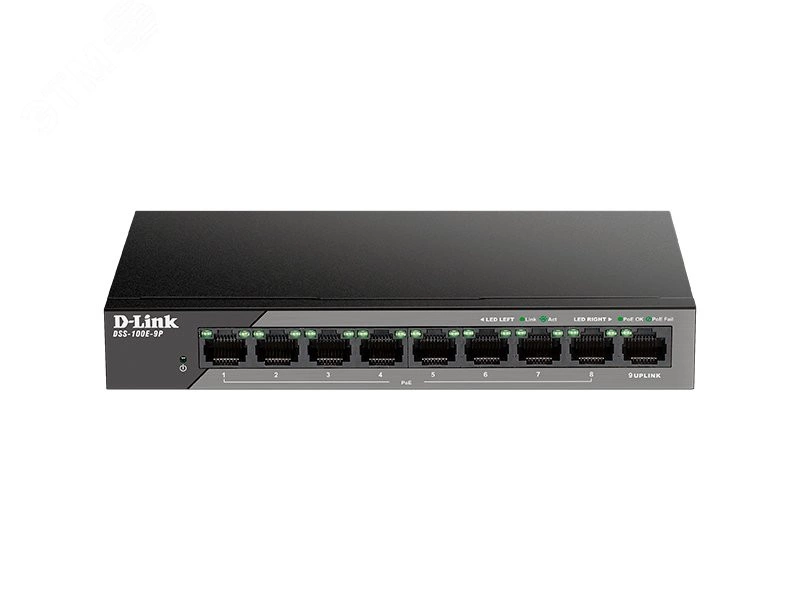 Неуправляемый коммутатор DSS-100E-9P, оснащенный 8 портами 10/100Base-TX с поддержкой PoE и 1 портом 10/100/1000Base-T, позволяет пользователям легко подключать и подавать питание по Ethernet-кабелям на PoE-совместимые устройства, например на сетевые камеры, и является оптимальным решением для развертывания систем видеонаблюдения. Защита от статического электричества 6 кВ на всех портах обеспечивает их устойчивость к наведенному напряжению.