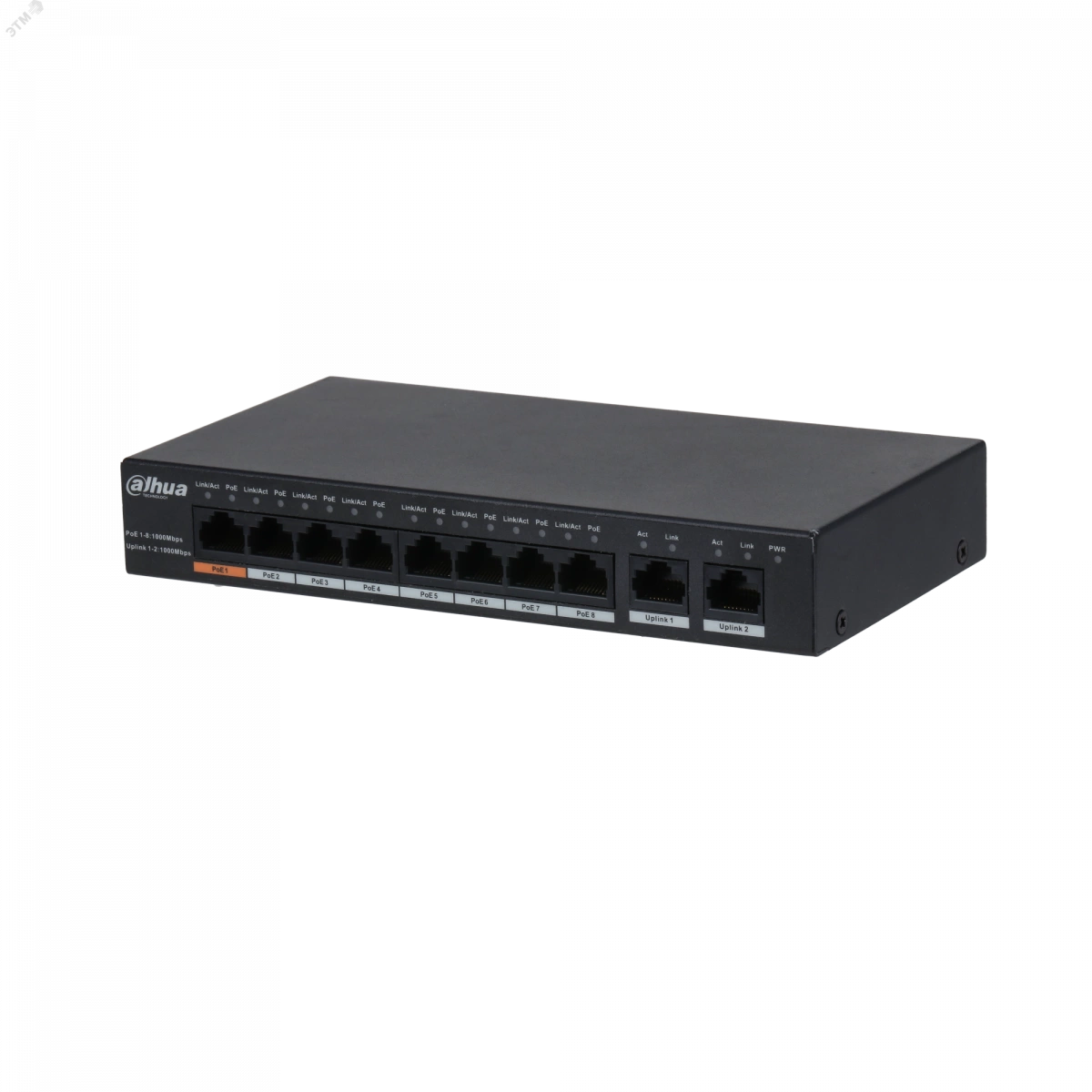 Коммутатор 8-портовый неуправляемый с РоЕ, порты - 8 RJ45 10/100/1000Мбит/с (PoE/PoE+), 2 RJ45 10/100/1000Мбит/с (uplink), мощность PoE - порт 1 до 60Вт, порты 2-8 до 30Вт, суммарно до 96Вт