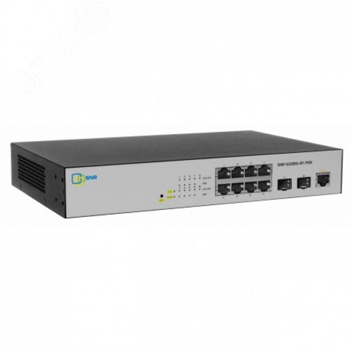 SNR-S2200G-8T-POE - Web Smart PoE коммутатор, оснащенный 2 портами SFP 100/1000BaseX и 8 портами 10/100/1000BaseT с поддержкой POE IEEE802.3af/at. Суммарная мощность PoE до 100W. Поддержка PoE 802.3at/af на всех 8 портах позволяет питать IP/видео-телефоны, Wi-Fi-точки, тонкие клиенты напрямую от коммутатора, что уменьшает стоимость владения и упрощает обслуживание инфраструктуры, а наличие Web-интерфейса обеспечивает простоту и удобство конфигурации коммутатора.