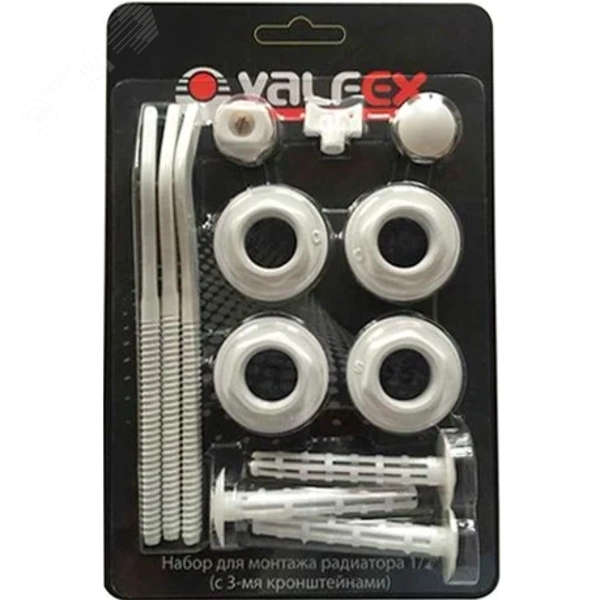 Комплекты для монтажа радиаторов VALFEX предназначены для монтажа алюминиевых и биметаллических радиаторов с присоединительным размером верхнего и нижнего коллекторов 1'' (внутренняя резьба). В состав комплекта включены четыре футорки 1 x 3/4'' (1 x 1/2'') - две правые и две левые, которые снабжены силиконовыми прокладками. Также в комплект включены пробка для футорки, ручной самоуплотняющийся воздухоотводчик, ключ для воздухоотводчика, кронштейны и дюбели для крепления радиатора к стене.Кронштейны, как и футорки выполнены из оцинкованной стали, окрашены белой (RAL 9010) эпоксидной эмалью. В качестве теплоносителя в системе может применяться как вода, так и незамерзающая жидкость.