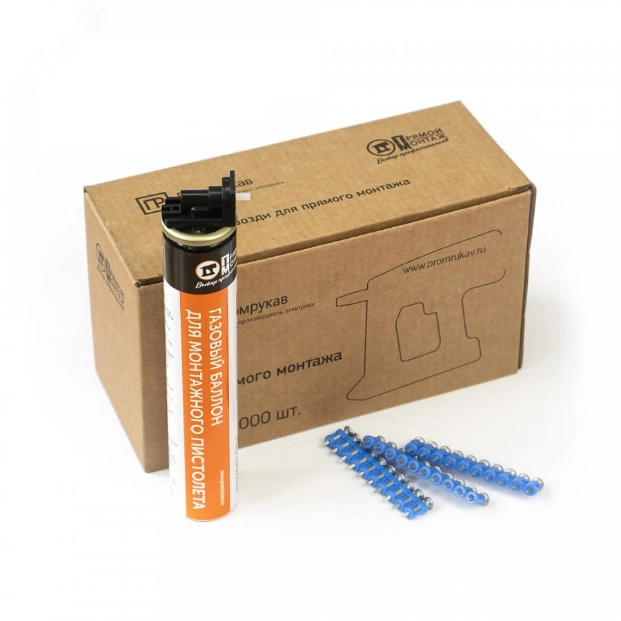Комплект из газового баллона и гвоздей для прямого монтажа от компании - производителя ''Промрукав'' предназначен для монтажных пистолетов. Газовый баллон - это основной топливный элемент для газовых гвоздезабивных инструментов. Его длина 165 мм. Он позволяет забить от 1000 до 1400 гвоздей с одного баллона. Баллон предназначен для монтажных пистолетов с энергией выстрела от 80 до 110Дж. Специальная смесь сжиженного газа и лубрикантов позволяет продолжительно использовать инструмент без смазки основных узлов. Гвозди при помощи монтажного пистолета применяются для крепления различных изделий практически к любым несущим поверхностям. Благодаря особенностям конструктива и материала изготовления гвоздей, возможен монтаж изделий не только к бетонным поверхностям различной прочности, но и к кирпичным стенам или металлическим поверхностям толщиной до 5 мм включительно.