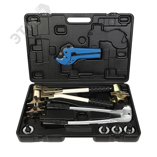 Комплект инструментов  предназначен для создания соединения на основе аксиальных фитингов с трубой. В комплект поставки входит два типа инструмента –расширитель и натяжитель. Комплект поставляется в индивидуальном кейсе. В нем находятся специальные насадки для двух инструментов по 4 шт., для различных диаметров труб и фитингов –16, 20 ,25 и 32 мм.