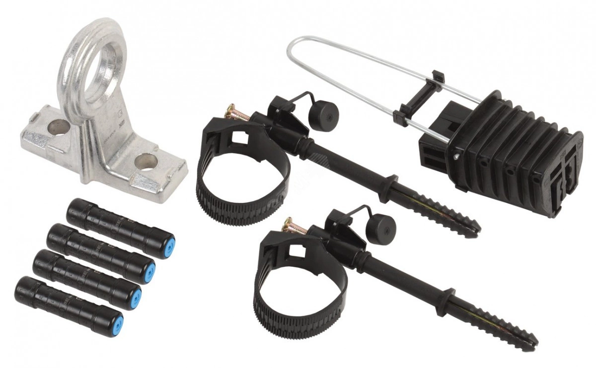 Комплект фасадного крепления типа КФК предназначен для промежуточного крепления и стяжки в пучок самонесущих изолированных проводов (СИП), напряжением до 1 кВ, на опорах и стенах зданий. Корпус изготовлен из полимера, устойчивого к ультрафиолетовому излучению и погодно-климатическим факторам. Дюбельная часть арматуры устанавливается в отверстие 012 мм, фиксируется гвоздем. Комплект КФК имеет специальный паз, позволяющий осуществить прокладку второй линии вдоль имеющейся трассы с помощью хомутов ХС. Комплект крепления к зданию КЗ-8 ИЭК включает в себя: 1) КАМ-4000 - 1 шт. 2) ЗАБ 16-25 - 1 шт. 3) КФК 12-47.6 - 2 шт. 4) ГИА 10-16 - 2 шт. 5) ГИА 16 - 2 шт.