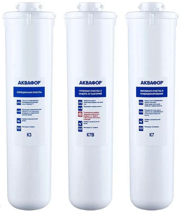 В комплекте три картриджа: K3, K7B и K7. Они задерживают частицы размером больше 5, 0,1 микрона и 0,8 микрон соответственно. Картридж K7B очищает воду от бактерий и паразитов. Половину объема занимает мембрана с порами в 1000 раз тоньше человеческого волоса. Все три картриджа поглощают из воды вредные примеси: хлор, железо, свинец и другие тяжелые металлы, нефтепродукты, пестициды и другие органические соединения. Благодаря картриджу K7 вода после очистки ничем не пахнет. Картриджи не удаляют жесткость (избыток минеральных солей, из-за которого появляется накипь) и расчитаны на мягкую воду. Все три картриджа заменяются одновременно. Замена комплекта – раз в год (в семье до 7 человек). Если вас больше – срок замены может наступить раньше. Ориентируйтесь на то, что заменить картриджи обязательно после использования 8000 литров воды.