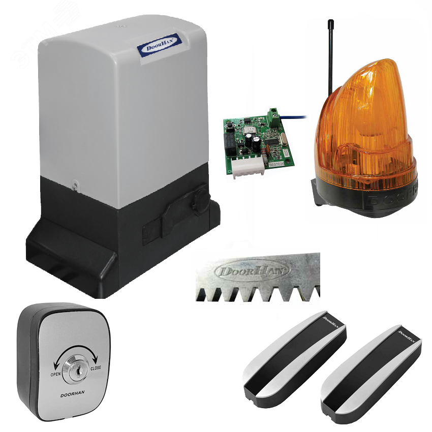 Комплект привода для откатных ворот весом до 1300 кг, шириной до 4 м, 220 В, 550 Вт, интенсивность использования 70 %, IP54, -40...+55 град.С. Комплект: привод SLIDING-1300 со встроенным радиоприемником, рейка DHRACK 4 шт,ключ-кнопка KEYSWITCH-N