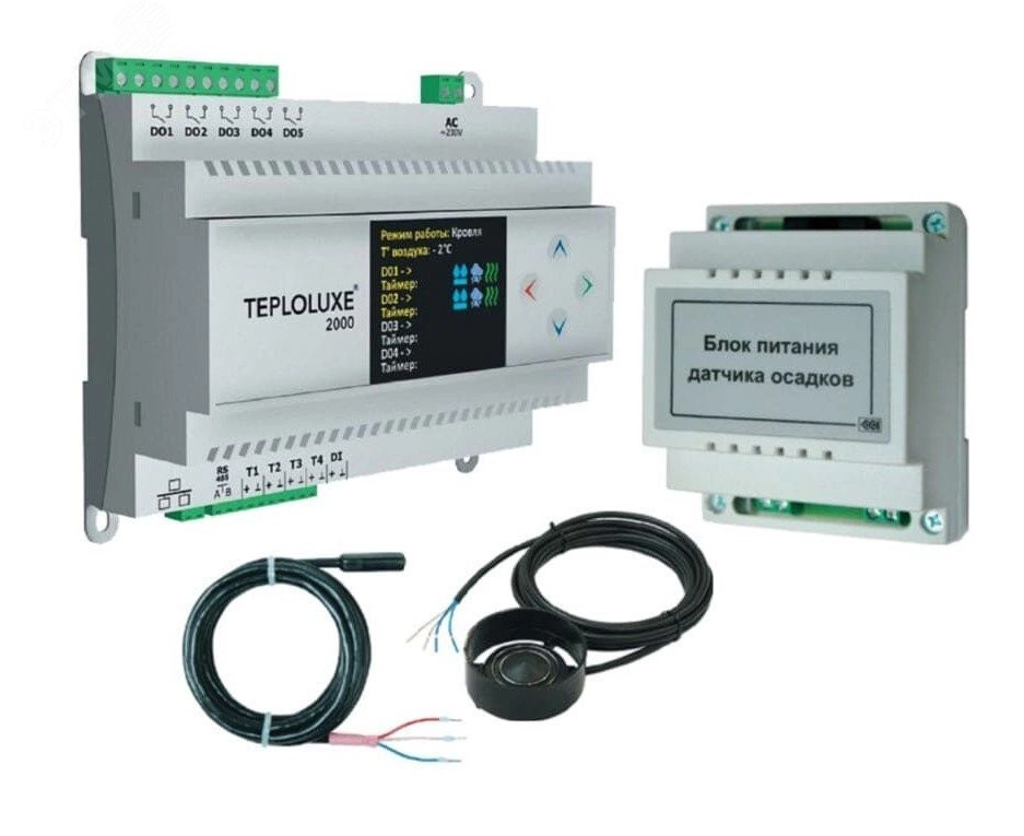 Комплект системы автоматического управления (автоматики) системой поверхностного водяного снеготаяния для предотвращения образования сугробов и наледей. Принцип работы – по показаниям датчиков температуры и осадков контроллер открывает/закрывает шаровой кран с помощью электропривода и/или включает/останавливает циркуляционный насос, тем самым запускает/останавливает циркуляцию теплоносителя в контуре труб системы снеготаяния, нагревает/останавливает нагрев поверхности наружной площадки, предотвращая образование сугробов и наледи.