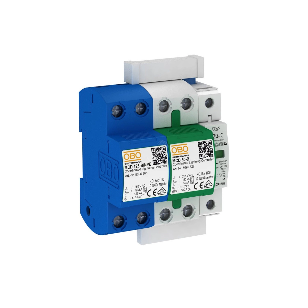 Серия PS..: Protection Set молниеразрядник и разрядник защиты от перенапряжения типа 1+2 (класса B+C) согласно VDE 0675, часть 6-11 (DIN EN 61643-11)., Токоотводящая способность:100 kA 10/350 µs с допуском ВET., Устройство поставляется предварительно смонтированным и готовым к подключению., Включ. соединительные перемычки и маркированные соединительные клеммы., Для использования в сетях TN-C. Примечание: входной предохранитель (макс.) 125 A (необходим только для сетей без входного предохранителя).