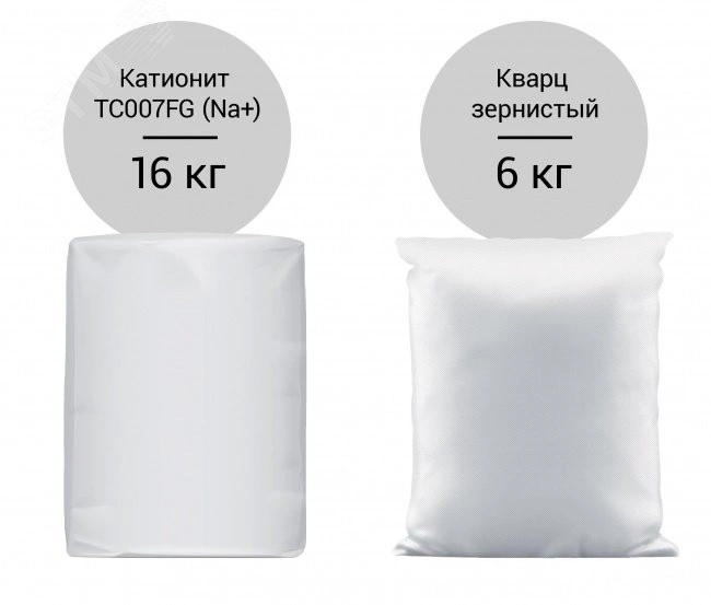 Комплект загрузки - кварц зернистый 3-5 мм, 6 кг, катионит TC007FG (Na+), 16 кг. кварц зернистый - Фильтрующий материал, получаемый дроблением и рассевом породы, характеризующейся высоким содержанием оксида кремния (до 99 процентов) и незначительным количеством растворимых соединений кальция, железа и марганца. Используются в системах водоподготовки для удаления взвешенных частиц в качестве фильтрующего материала или поддерживающего слоя основной загрузки, который предотвращает вынос ее из фильтра и забивание дренажно–распределительной системы. Катионит - сильнокислотный катионит гелевого типа в Na-форме. Используется для умягчения воды. Обладает ёмкостью 1800 мг-экв/л.