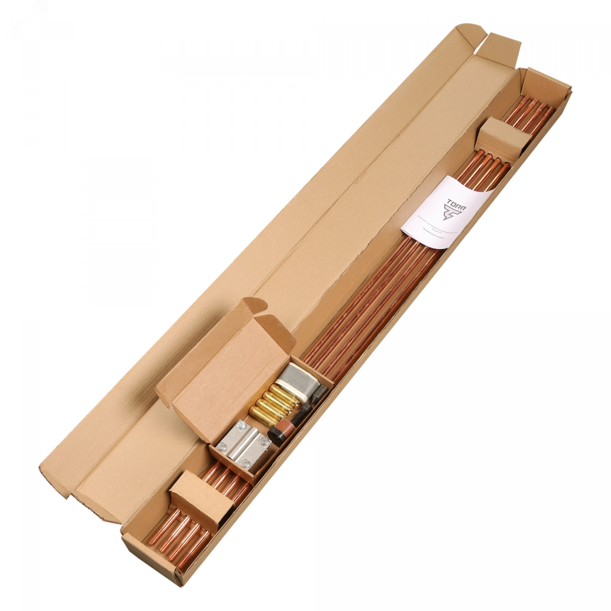Комплект омедненного заземления TORR-6М-16 представляет собой модульно-штыревую конструкцию рабочее состояние которых не зависит от климатических условий. Высокая устойчивость к коррозии обеспечивается благодаря медному покрытию вертикальных заземлителей, а также использовании токопроводящей пасты и гидроизоляционной ленты. Срок службы комплекта заземления в грунте может достигать 70 лет. Основным элементом модульно-штыревого заземления является, стальной стержень, покрытый слоем меди (250 мкм). На концах стержня имеется резьба для соединения стержней с латунными муфтами. Комплект предназначен для обеспечения заземления щитка частного дома, газовый котел, дизельные и электрогенераторы, а также применяется в составе систем молниезащиты.
