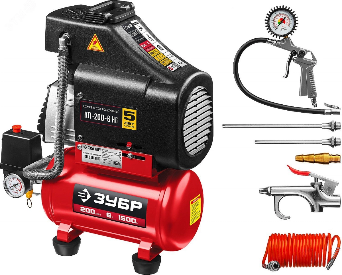 Компрессор воздушный безмасляный с набором аксессуаров, 200 л/мин, 6 л, 1500 Вт