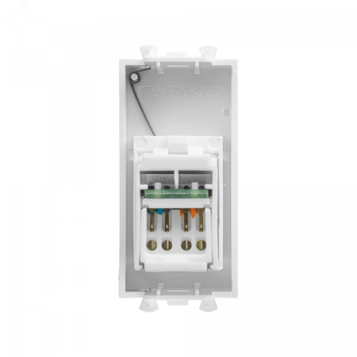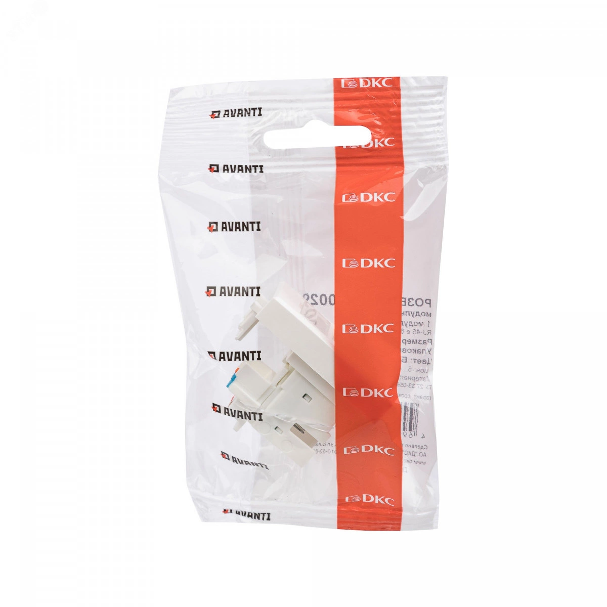Компьютерная розетка RJ-45 модульная. Категория- 6. Предназначена для монтажа в системы 'In-liner Front' и 'In-liner Aero' при помощи рамок-суппортов и каркасов 'Avanti' (код 4400912 и т.д.). Используется для подключения сетевого кабеля к рабочему месту. Характеристики- 8P8C. С пылезащитной шторкой, с маркировочной табличкой. В комплекте разъем Keystone, заделка без инструмента. Фиксация в подрозеточные коробки глубиной не менее 45 мм при помощи каркаса с лапками (код 4400802) и саморезов. 1 модуль. Цвет- 'Белое облако'.