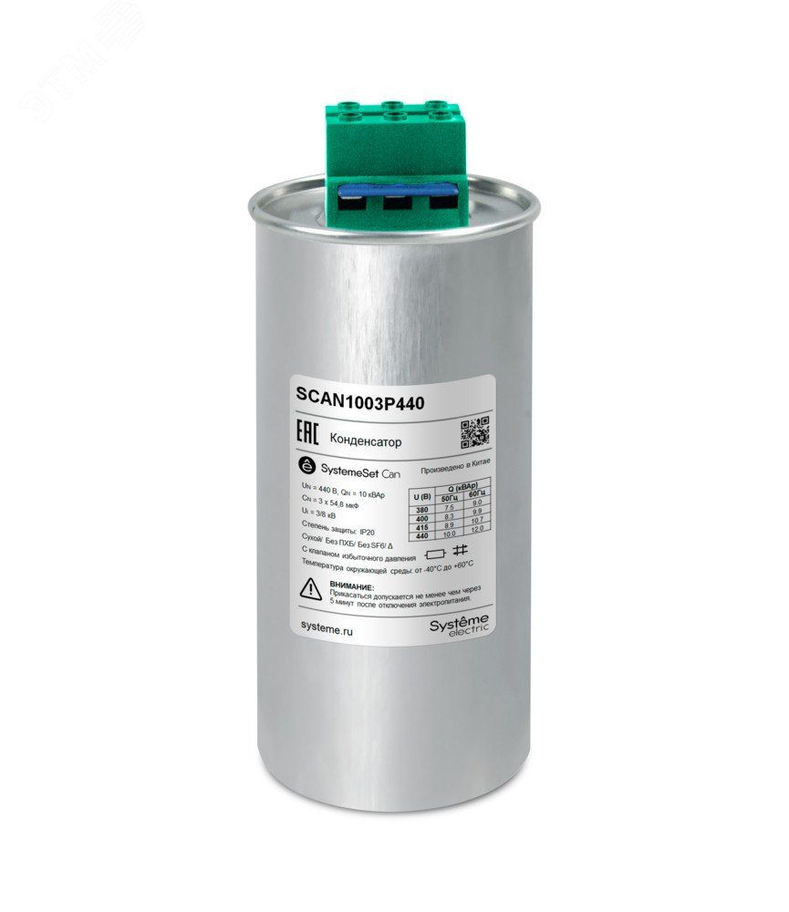 Низковольтный трёхфазный конденсатор торговой марки Systeme Electric серии SystemeSet типа Can предназначен для компенсации реактивной мощности. Силовой конденсатор представляет собой три однофазных конденсатора, собранных в единую конструкцию. В конденсаторах в качестве диэлектрика используется металлизированная полипропиленовая плёнка с функцией самовосстановления. В конструкцию конденсатора также входят – предохранитель с мембраной избыточного давления, клеммный блок с разрядным резистором. Корпус конденсатора выполнен из экструдированного алюминия. В качестве пропитки используется сухая биоразлагаемая смола без ПХБ, без SF6. Номинальная мощность 10 кВАр, номинальное напряжение 440 В, температура окружающей среды от -40 до +60 градусов Цельсия, Ф95, длительно выдерживаемый ток 2 In, максимальный пусковой ток 400 In, степень защиты IP20.