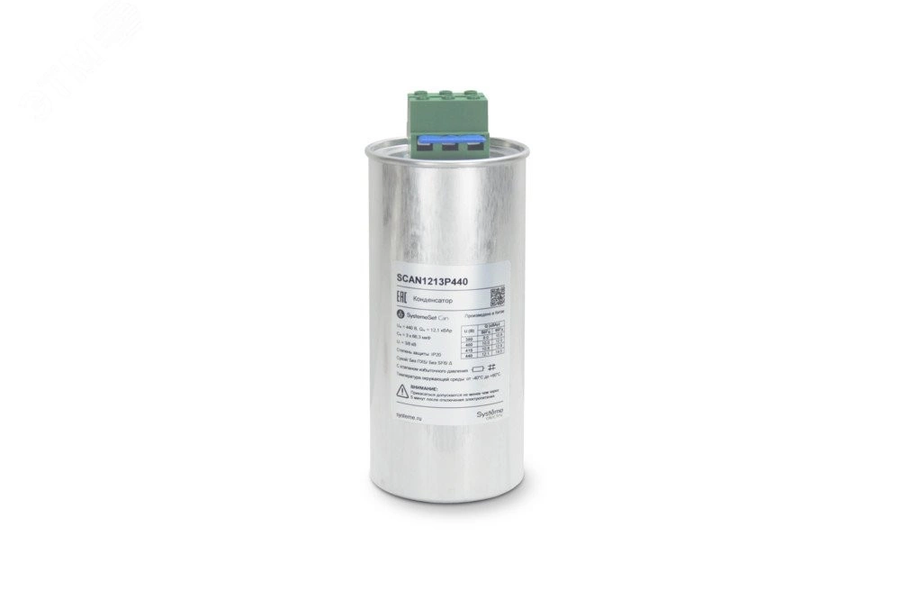 Низковольтный трёхфазный конденсатор торговой марки Systeme Electric серии SystemeSet типа Can предназначен для компенсации реактивной мощности. Силовой конденсатор представляет собой три однофазных конденсатора, собранных в единую конструкцию. В конденсаторах в качестве диэлектрика используется металлизированная полипропиленовая плёнка с функцией самовосстановления. В конструкцию конденсатора также входят – предохранитель с мембраной избыточного давления, клеммный блок с разрядным резистором. Корпус конденсатора выполнен из экструдированного алюминия. В качестве пропитки используется сухая биоразлагаемая смола без ПХБ, без SF6. Номинальная мощность 12,1 кВАр, номинальное напряжение 440В, температура окружающей среды от -40 до +60 градусов Цельсия, Ф95, длительно выдерживаемый ток 2In, максимальный пусковой ток 400In, степень защиты IP20.