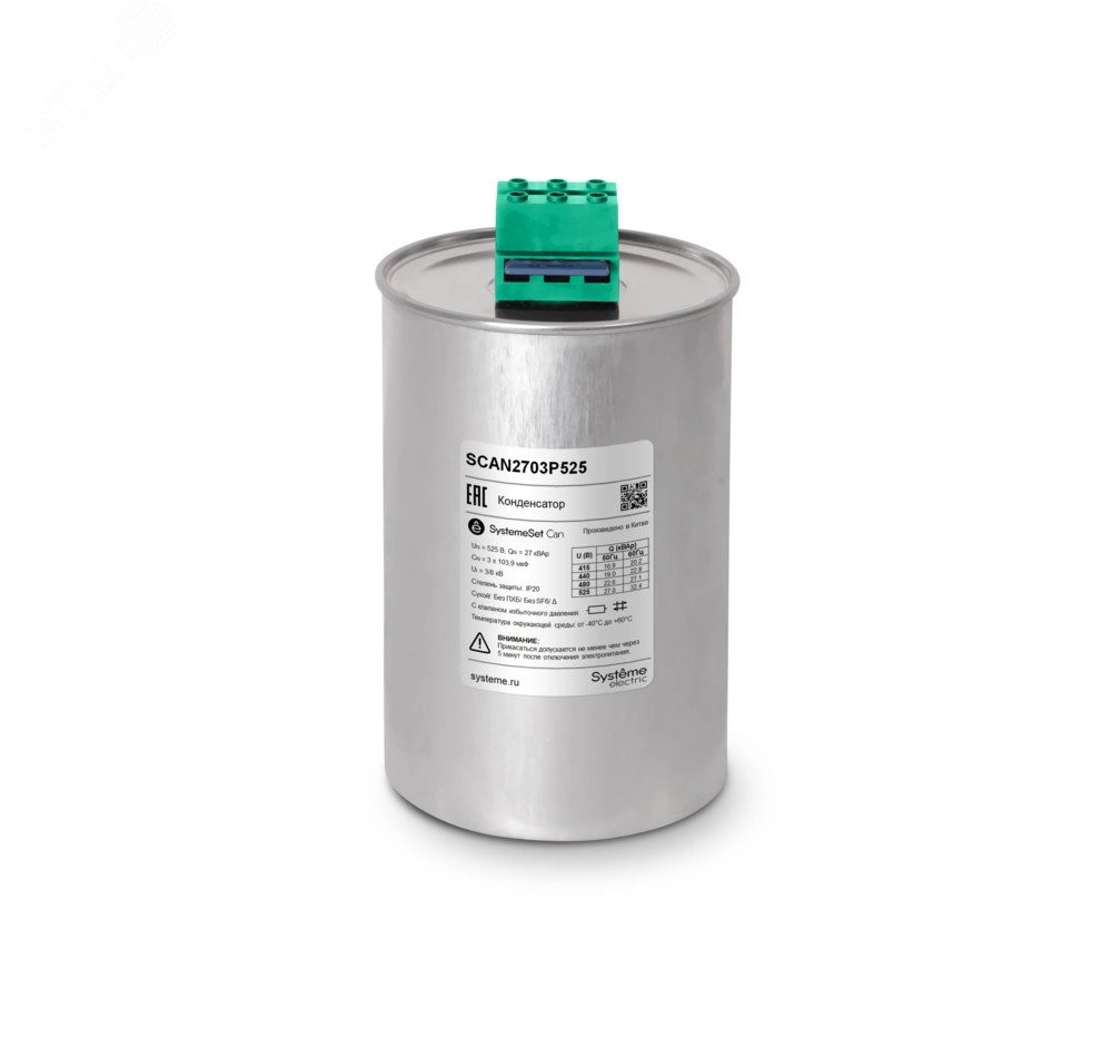 Низковольтный трёхфазный конденсатор торговой марки Systeme Electric серии SystemeSet типа Can предназначен для компенсации реактивной мощности. Силовой конденсатор представляет собой три однофазных конденсатора, собранных в единую конструкцию. В конденсаторах в качестве диэлектрика используется металлизированная полипропиленовая плёнка с функцией самовосстановления. В конструкцию конденсатора также входят предохранитель с мембраной избыточного давления, клеммный блок с разрядным резистором. Корпус конденсатора выполнен из экструдированного алюминия. В качестве пропитки используется сухая биоразлагаемая смола без ПХБ, без SF6. Номинальная мощность 27 кВАр, номинальное напряжение 525В, температура окружающей среды от -40 до +60 градусов Цельсия, Ф136, длительно выдерживаемый ток 2In, максимальный пусковой ток 400In, степень защиты IP20.