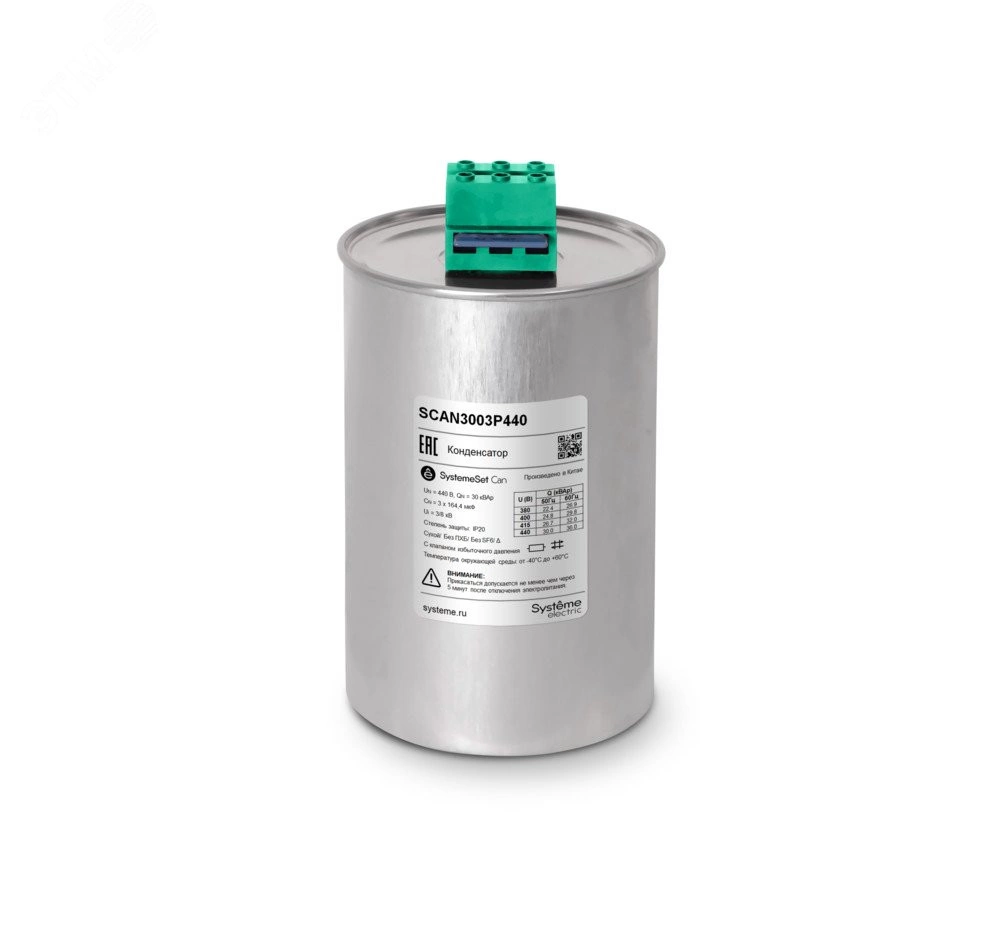 Низковольтный трёхфазный конденсатор торговой марки Systeme Electric серии SystemeSet типа Can предназначен для компенсации реактивной мощности. Силовой конденсатор представляет собой три однофазных конденсатора, собранных в единую конструкцию. В конденсаторах в качестве диэлектрика используется металлизированная полипропиленовая плёнка с функцией самовосстановления. В конструкцию конденсатора также входят предохранитель с мембраной избыточного давления, клеммный блок с разрядным резистором. Корпус конденсатора выполнен из экструдированного алюминия. В качестве пропитки используется сухая биоразлагаемая смола без ПХБ, без SF6. Номинальная мощность 30 кВАр, номинальное напряжение 440В, температура окружающей среды от -40 до +60 градусов Цельсия, Ф136, длительно выдерживаемый ток 2In, максимальный пусковой ток 400In, степень защиты IP20.