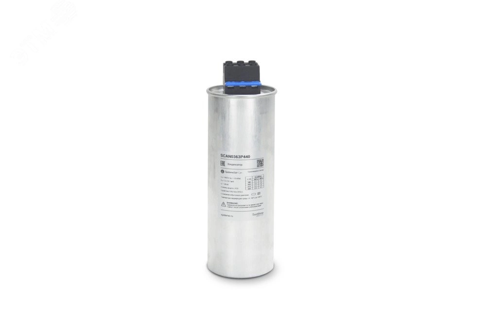 Низковольтный трёхфазный конденсатор торговой марки Systeme Electric серии SystemeSet типа Can предназначен для компенсации реактивной мощности. Силовой конденсатор представляет собой три однофазных конденсатора, собранных в единую конструкцию. В конденсаторах в качестве диэлектрика используется металлизированная полипропиленовая плёнка с функцией самовосстановления. В конструкцию конденсатора также входят, предохранитель с мембраной избыточного давления, клеммный блок с разрядным резистором. Корпус конденсатора выполнен из экструдированного алюминия. В качестве пропитки используется сухая биоразлагаемая смола без ПХБ, без SF6. Номинальная мощность 3,6 кВАр, номинальное напряжение 440 В, температура окружающей среды от -40 до +60 градусов Цельсия, Ф75, длительно выдерживаемый ток 2 In, максимальный пусковой ток 400 In, степень защиты IP20.