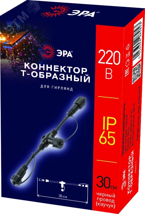 Коннектор ERAPS-C для гирлянд Т-образный IP65 каучук черный ЭРА