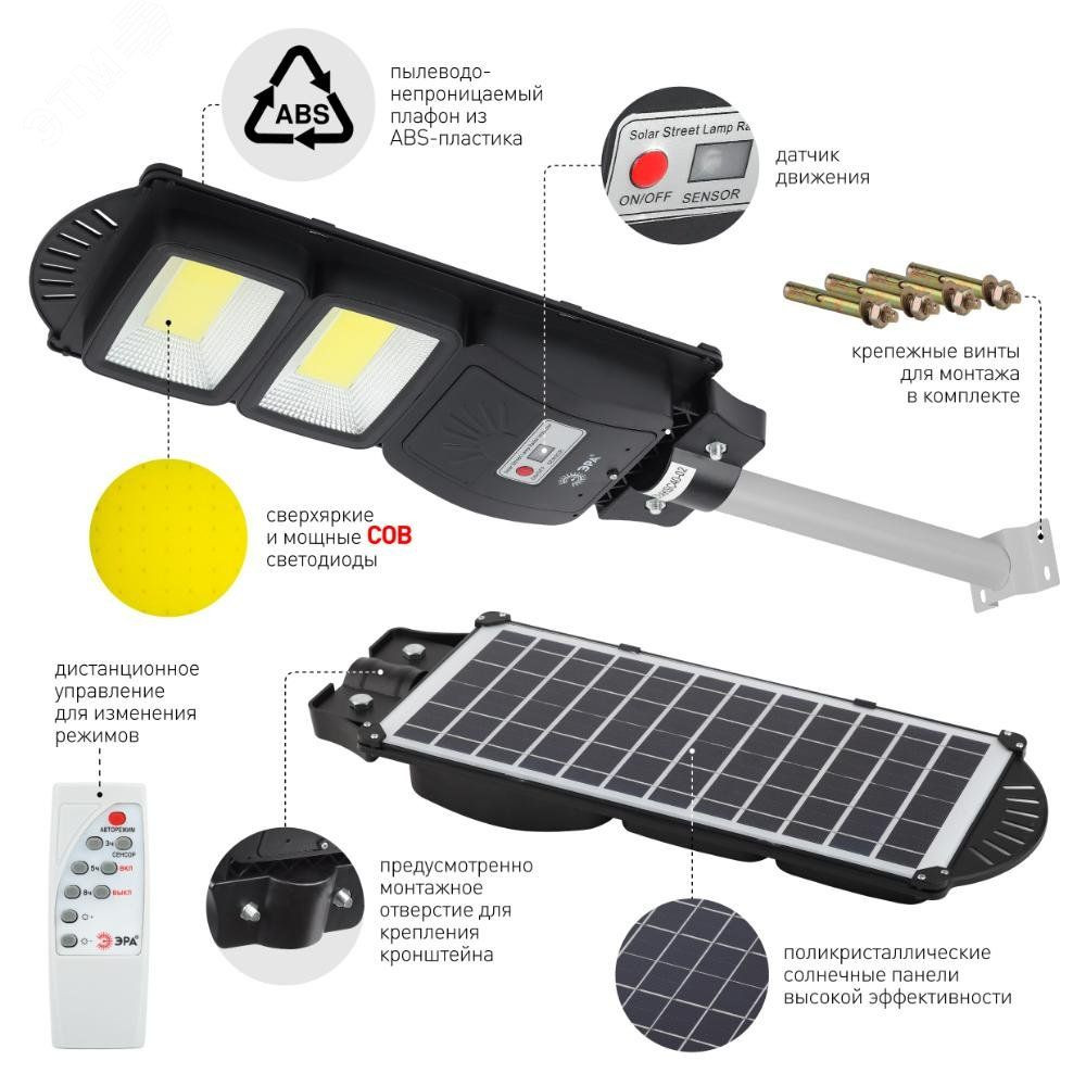 Возможность использования в тех местах, где отсутствует доступ к централизованной электрической сети. В светильниках используются специальные морозоустойчивые аккумуляторы Li-FeP04, которые обеспечивают устойчивую работу при температурах от -20 C до +60 С. Отсутствие расходов на электроэнергию. Нетребовательность в уходе. Фонари на солнечных батареях не нуждаются в заправке топливом и проведении профилактического обслуживания. Пылеводонепроницаемый плафон. Возможность быстрой замены АКБ. Дистанционное управление для изменения режимов. Датчик движения. Комплект для установки и монтажа. Диаметр кронштейна для крепления до 50 мм.