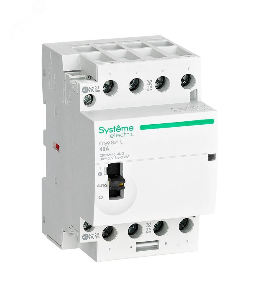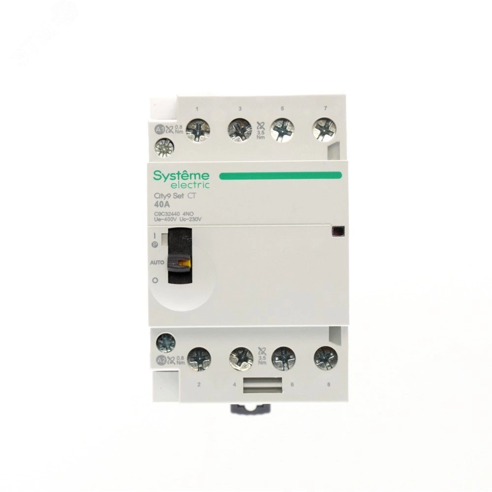 Контактор CT серии City9 Set Systeme Electric на номинальный ток 40 А (AC7a / AC7b), 4НО, номинальное напряжение силовой цепи - 400В, напряжение цепи управления - 230В, ширина 54 мм. В сочетании с автоматическими выключателями или АВДТ обеспечивают дистанционное управление в однофазных и трехфазных цепях переменного тока (освещение, отопление, вентиляция, жалюзи и т.п.) Управление неприоритетными нагрузками с помощью мастер-выключателя. Механический индикатор положения контактов. Крепление защёлкиванием на DIN-рейке шириной 35 мм.