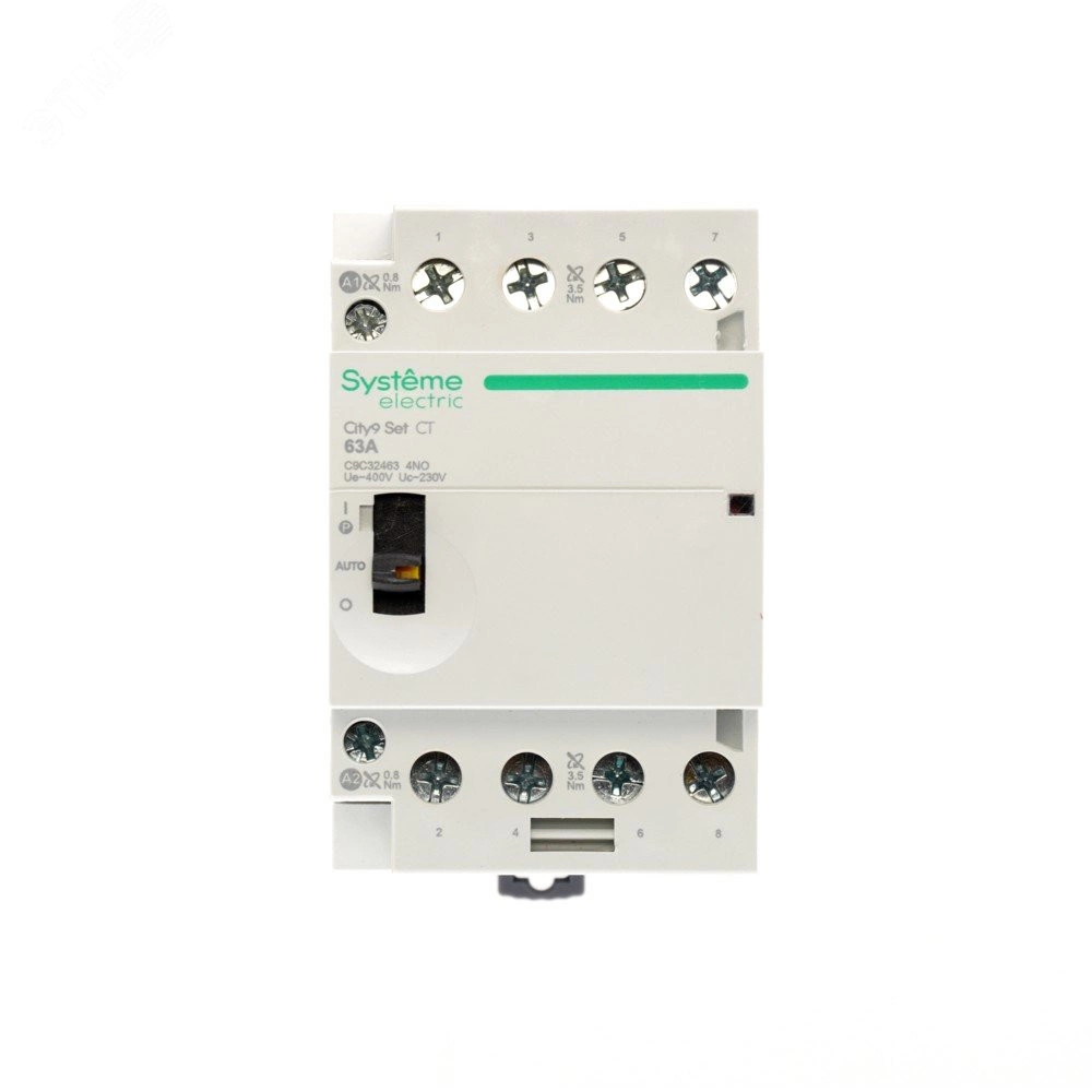 Контактор CT серии City9 Set Systeme Electric на номинальный ток 63 А (AC7a / AC7b), 4НО, номинальное напряжение силовой цепи - 400В, напряжение цепи управления - 230В, ширина 54 мм. В сочетании с автоматическими выключателями или АВДТ обеспечивают дистанционное управление в однофазных и трехфазных цепях переменного тока (освещение, отопление, вентиляция, жалюзи и т.п.) Управление неприоритетными нагрузками с помощью мастер-выключателя. Механический индикатор положения контактов. Крепление защёлкиванием на DIN-рейке шириной 35 мм.