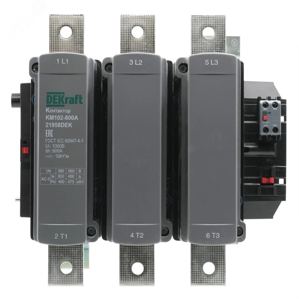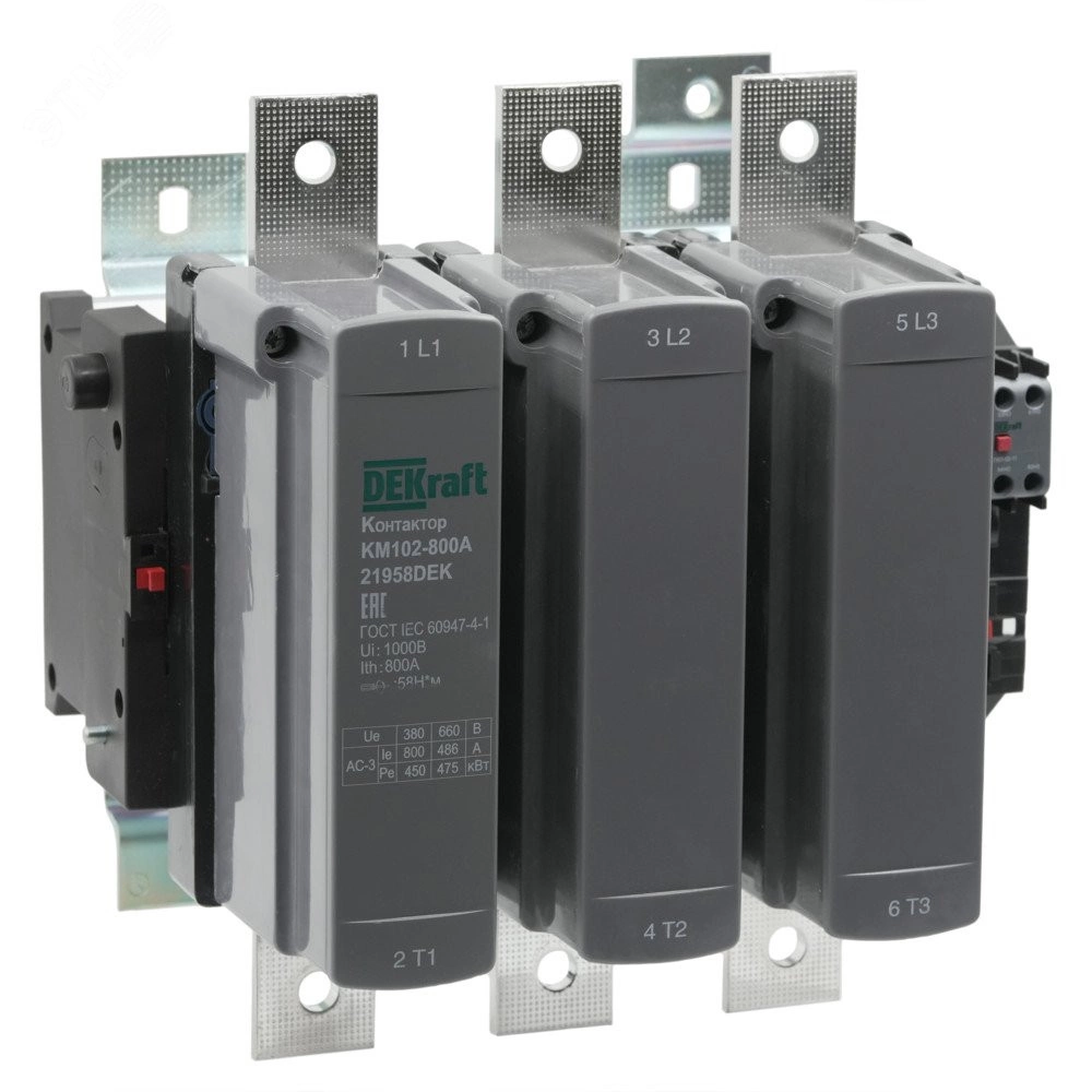 Контактор серии КМ-102 Dekraft, 3P, номинальный ток - 800 А (AC3, AC4), напряжение управления 230 В пер.тока, доп.контакты 1НО+1НЗ, установка на монтажную плату. Контакторы КМ-102 предназначены для пуска и останова асинхронных двигателей, для коммутации осветительных сетей, в сетях напряжением до 690 В пер.тока. Дополнительные защитные крышки исключают попадание пыли внутрь контактора и обеспечивают защиту от случайного прикосновения.