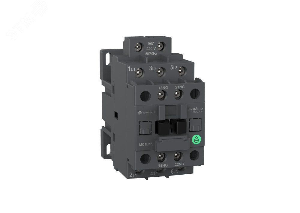 Контактор серии SystemePact MC1D на номинальный ток 12 А, 3P, 1НО+1НЗ, напряжение управления – 220 В пер. тока, крепеж – на DIN-рейке или монтажной плате. Контакторы серии SystemePact MC1D разработаны для управления двигателями различных типов, а также насосами, лифтов и системами вентиляции. Они имеют увеличенный электрический и механический ресурс, могут оснащаться дополнительными контактами, тепловыми реле, механическими блокировками, ограничителями перенапряжений.