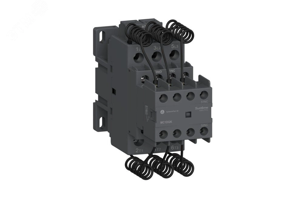 Контактор серии SystemePact MC1D для конденсаторных батарей, номинальная мощность – 10 кВАр, 3P, 1НО+2НЗ, напряжение управления – 110 В пер.тока, категория применения – AC-6b, монтаж – на DIN-рейке или на монтажной плате с помощью винтовых зажимов. Контакторы серии SystemePact M MC1DE…WK предназначены для коммутации трехфазных одно- и многоступенчатых конденсаторных батарей, оснащены блоком контактов предварительного срабатывания и гасящих резисторов, ограничивающих величину тока до 60In.