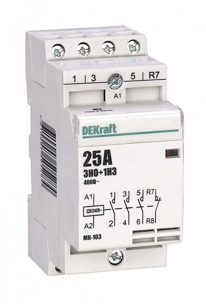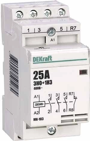 Модульный контактор серии МК-103 DEKraft, ном.ток 20 А (АС-7а), кол-во и исполнение контактов - 3НО+1НЗ, напряжение управления 220 В пер.тока, ширина - 2 мод. х 18 мм, установка - на DIN-рейку. Контакторы МК-103 применяются в сетях напряжением до 400 В пер.тока для дистанционного управления небольшими нагрузками, требующими большого количества включений / отключений, например, насосы, системы вентиляции и т.п. Модульные контакторы не требуют дополнительных настроек и специального обслуживания.