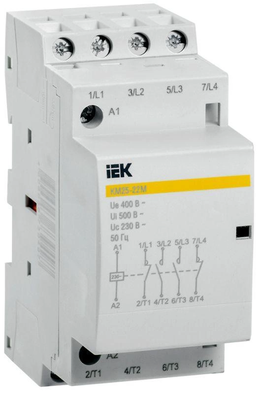 Контакторы модульные типа КМ торговой марки IEK предназначены для применения в сетях переменного тока напряжением до 400 В частоты 50 Гц и служат для коммутации слабоиндуктивных нагрузок с номинальным током до 63 А.
