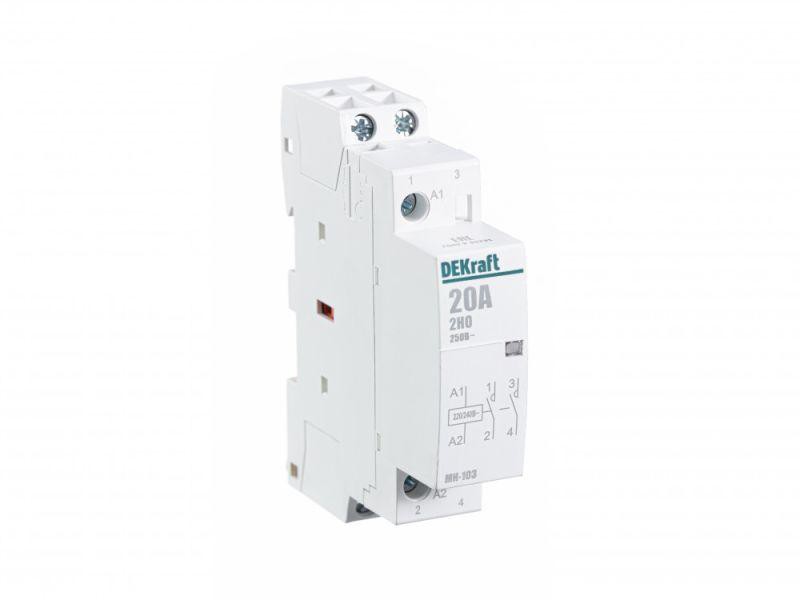 Модульный контактор серии МК-103 DEKraft; ном.ток 20 А (АС-7а); кол-во и исполнение контактов – 2НО; напряжение управления 220 В пер.тока; ширина – 1 мод. х 18 мм; установка – на DIN-рейку. Контакторы МК-103 применяются в сетях напряжением до 400 В пер.тока для дистанционного управления небольшими нагрузками, требующими большого количества включений / отключений, например, насосы, системы вентиляции и т.п. Модульные контакторы не требуют дополнительных настроек и специального обслуживания.
