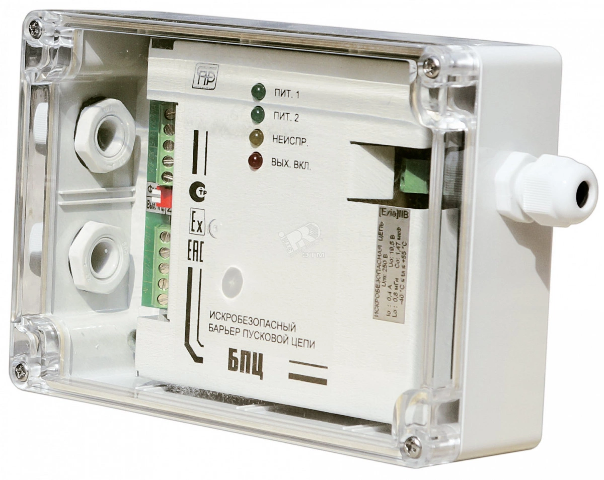 Барьер искробезопасности пусковой цепи предназначен для обеспечения искробезопасности пусковой цепи, непрерывного контроля ее исправности, выдачи информации о ее состоянии, а также управления выдачей напряжения в нагрузку по команде от прибора управления.