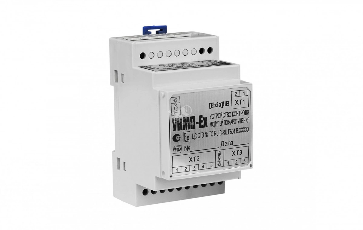 Устройство контроля модулей пожаротушения УКМП предназначено для контроля исправности цепи пуска с несколькими модулями пожаротушения на основе пиротехнических источников холодного газа, и инициации их пуска путем выдачи пускового тока по команде от прибора управления. Устройство УКМП-Ех является связанным электрооборудованием, имеет искробезопасную выходную цепь пуска и маркировку взрывозащиты `[Exiа]IIВ`, соответствует требованиям ГОСТ 30852.0, ГОСТ 30852.10 и устанавливается вне взрывоопасных зон. УКМП имеет световую индикацию работы при помощи зеленого светодиода НОРМА и красного светодиода ПУСК, а также сигнализацию во внешние цепи при помощи реле НОРМА с выходным контактами `сухого` типа. УКМП может находиться в двух режимах - режиме контроля и режиме пуска.