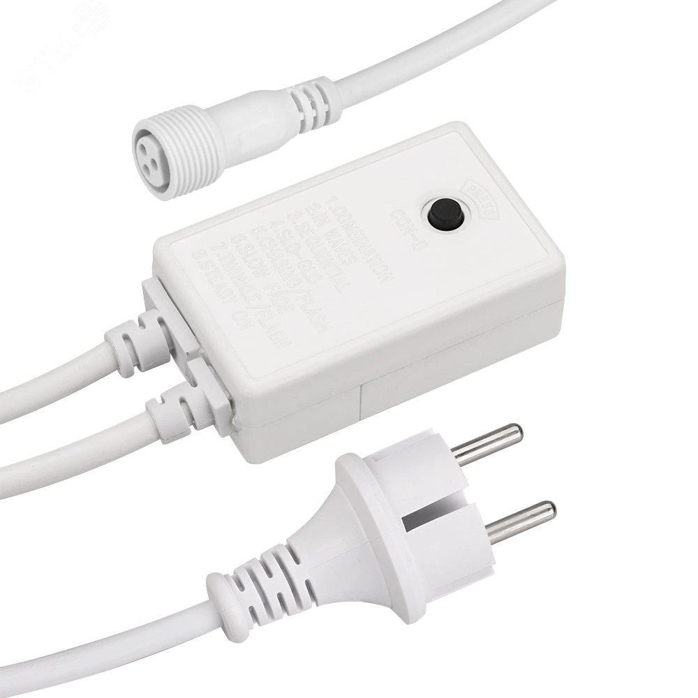Контроллер для светодиодных гирлянд с эффектом динамики. Материал оболочки ПВХ. Цвет провода белый. В комплект входит - провод питания с вилкой европейского стандарта (IP44), 3pin разъём подключения к гирлянде, выпрямитель AC/DC (1.6A), контроллер для смены режимов динамического свечения (8 режимов). Длина провода 1.5 метра.
