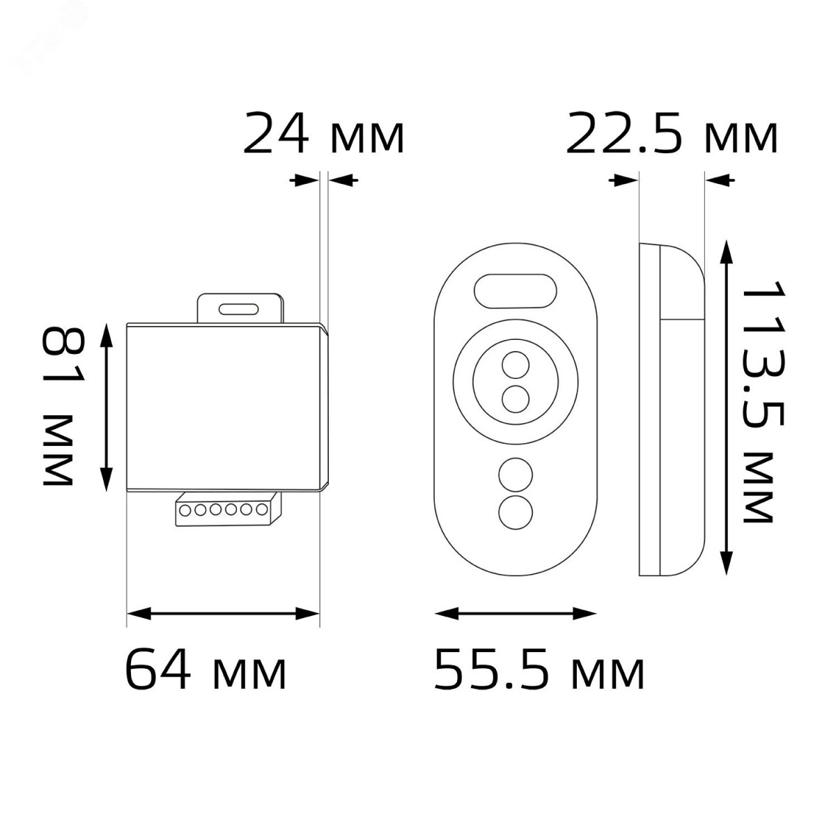 Возможно применение для лент 12В и 24В|Высокая выходная мощность|Сенсорный пульт управления в комплекте|Управление по радиоканалу, возможен скрытый монтаж основного блока|Монтажные отверстия для крепления к поверхности
