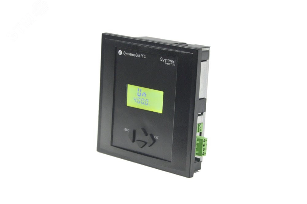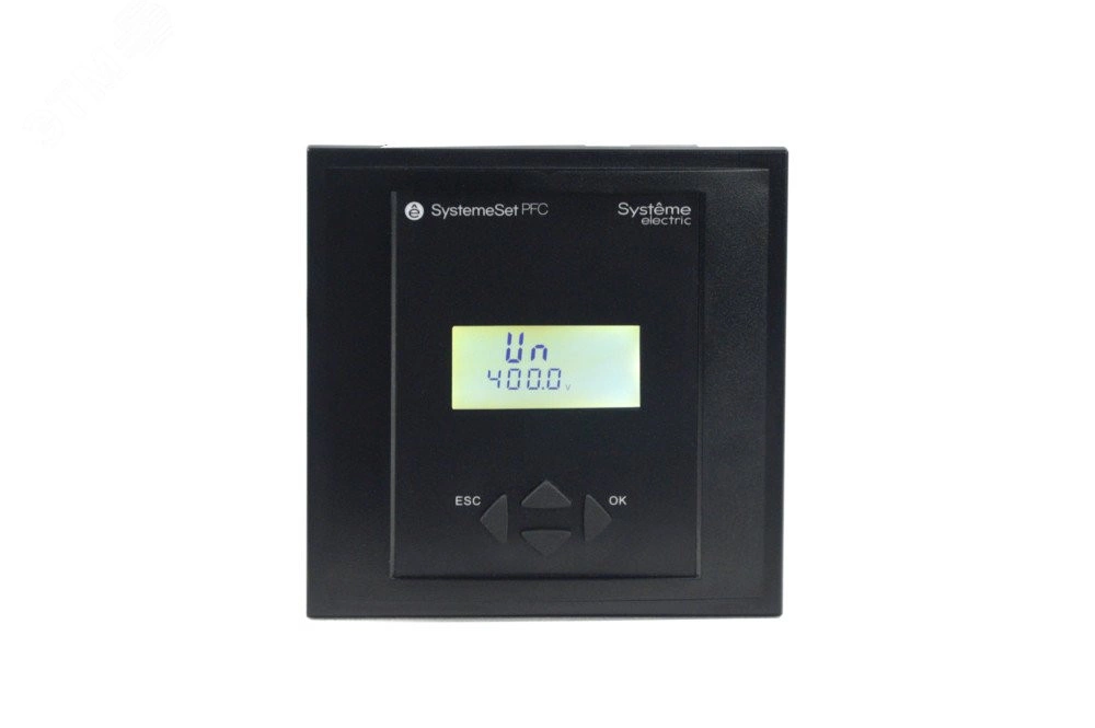 Контроллер коррекции коэффициента мощности торговой марки Systeme Electric cерии SystemeSet типа PFC необходим для измерения величины реактивной мощности и управления подключением/отключением ступеней регулирования УКРМ для обеспечения желаемого коэффициента мощности. Для компенсации реактивной мощности при разных нагрузках контроллер отслеживает активную и реактивную составляющую мощности путём измерения мгновенных значений напряжения и тока в электрической сети. На основе полученных данных вычисляется фазовый сдвиг между током и напряжением, полученное значение сравнивается с предварительно заданной величиной косинус фи. В зависимости от фактического отклонения коэффициента мощности контроллер подаёт команду на управление ступенями конденсаторных батарей. Напряжение 90-550 В, ток 5 мА-5А, 6 релейных выводов.