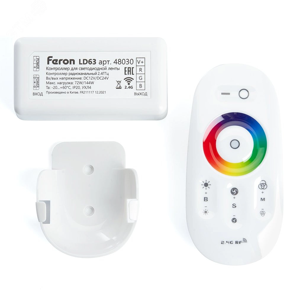Предназначен для управления RGB лентами, работающими от напряжения 12 или 24В. Много встроенных режимов. Возможность управлять яркостью и скоростью режимов. Удобная тачпанель в форме кольца для выбора цвета. Стильный дизайн. Крепление для пульта ДУ.