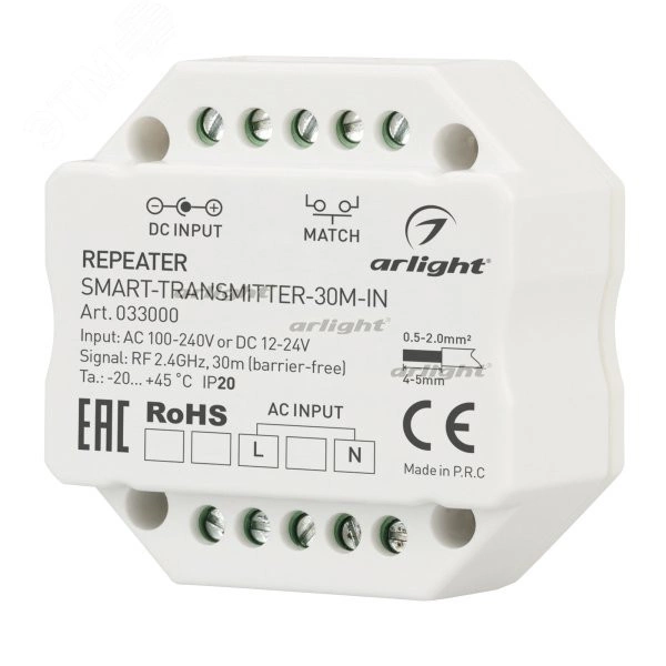Беспроводной приёмо-передатчик радиосигнала 2.4G для расширения дальности приема сигнала диммеров и контроллеров серии SMART. Установка в подрозетник. Напряжение питания AC 100-240V и DC 12-24V, потребляемая мощность не более 0.6Вт (AC) и 0.4Вт (DC), частота радиосигнала 2400Гц, дальность приема сигнала до 30 метров. Габариты 52х52х26 мм.