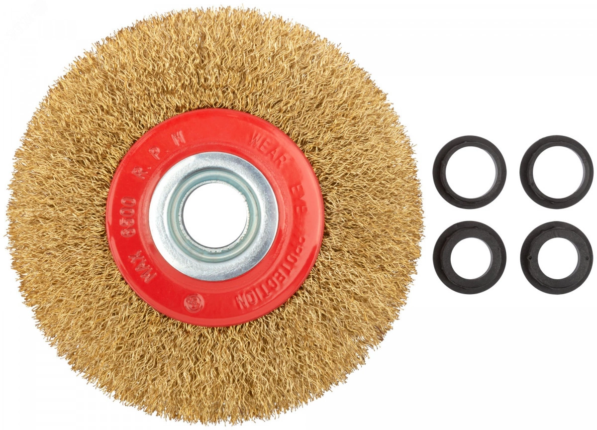 волнистая проволока толщиной 0,3 мм обеспечивает деликатную зачистку поверхностей|порошковое покрытие корпуса и латунированное покрытие проволоки предотвращают коррозию|5 адаптеров под различные посадочные диаметры позволяют устанавливать корщетки на