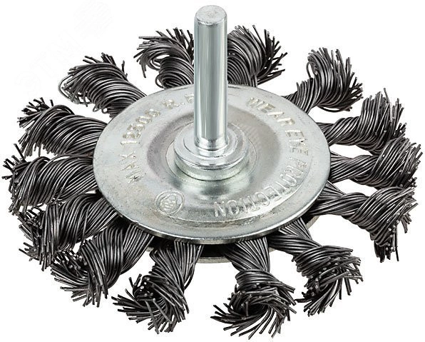 Тип 'колесо'. Для очистки поверхностей от краски ржавчины. Для дрели. Со шпилькой. Витая проволока. Материал - инструментальная сталь.