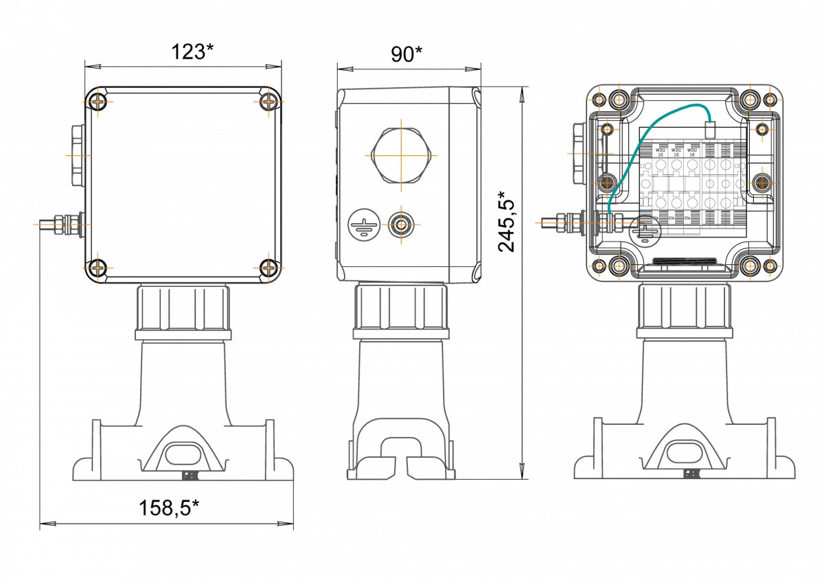 Коробка клеммная взрывозащищенная КВП с пластиковой опорой. Для подключения от 1 до 3-х плоских греющих кабелей или от 1 до 2-х сигнальных кабелей ?3-6 мм, 1 отверстие под М25, клеммная колодка 5 модулей 10 мм2 123*245*90