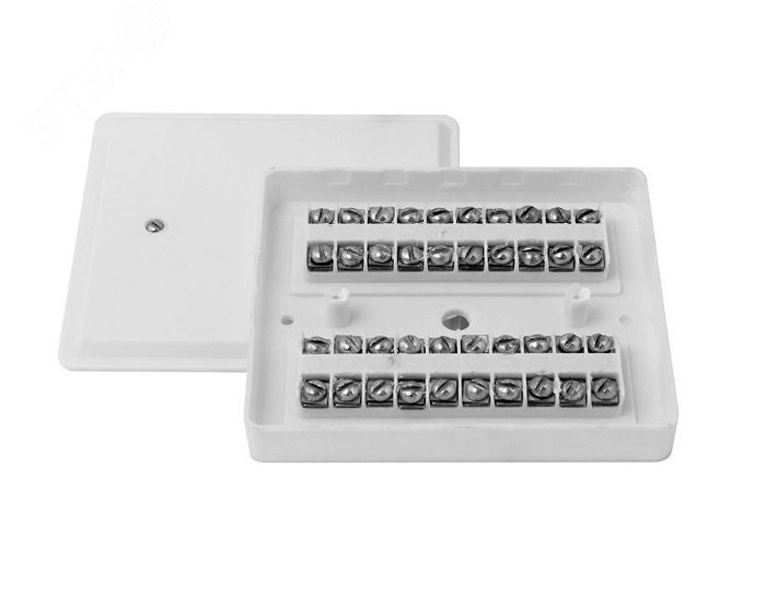 Коробка телефонная распределительная плоская. Рассчитана на 2х10 пар проводов, 120х100х22мм.