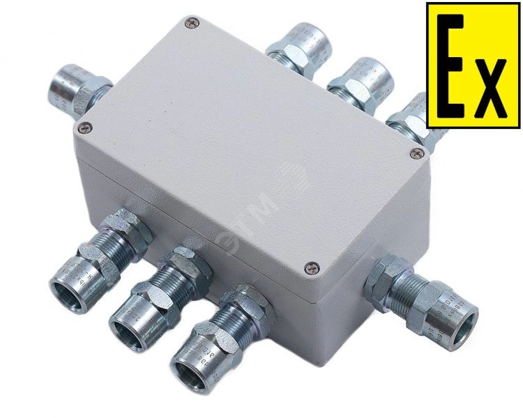 Коробка коммутационная КВМК 163609 (A(4 КВ М20КМ15-Л, 1 КВ М20КМ20-Л,2 КВ М25КМ25-Л)-С(3 КВ М32КМ32-Л)-(50х2,5ммПN). Предназначена для выполнения соединений (разветвлений) электрических цепей общего и специального назначения (силовых цепей, цепей управления, сигнализации и т.д.) во взрывоопасных зонах. Коробка служит для ввода бронированных, небронированных электрических кабелей круглого или плоского сечения и кабелей в металлорукаве.
