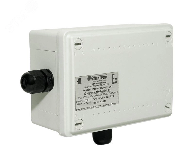 Коробка взрывозащищенная Спектрон МК-04-Exi, предназначена для подключения по 2-х или 4-х проводной линии связи извещателей производства Спектрон. Корпус коробки изготовлен из полиамида ПА66 и имеет степень защиты (IP65) от воздействия внешней среды.