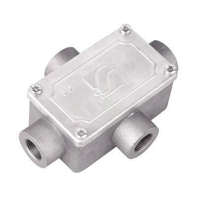 Коробка ответвительная алюминиевая, 4 ввода с метрической резьбой, IP55. Размер: 118х83х42 мм. Материал – алюминиевый сплав. Температура монтажа от -25 до +70 градусов по Цельсию. Обладает высокой стойкостью к коррозии. Назначение: ответвление и протяжка проводов и кабелей в жестких стальных трубах.