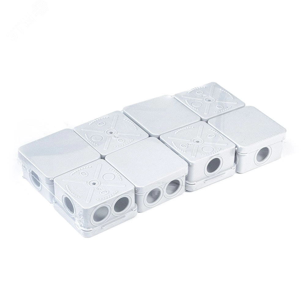 Распаячные (распределительные) коробки применяются для защиты мест соединения проводов и кабелей от механических повреждений, от проникновения пыли и влаги, а лаконичный дизайн способствуют эстетичному монтажу проводки. Коробки имеют высокую стойкость к воспламенению. Подходят для использования в закрытых помещениях. Материал изготовления коробок является безгалогенным, что позволяет использовать изделие в общественных местах, с высоким скоплением людей. Для удобства в ассортименте теперь появилась малая упаковка, состоящая из 8 штук изделий.